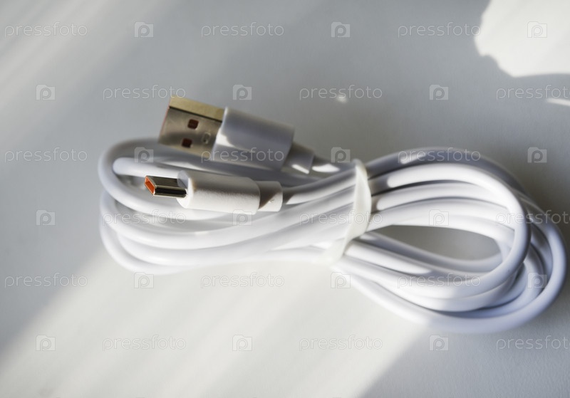 USB-кабель на белом фоне.Белый шприц для телефона
