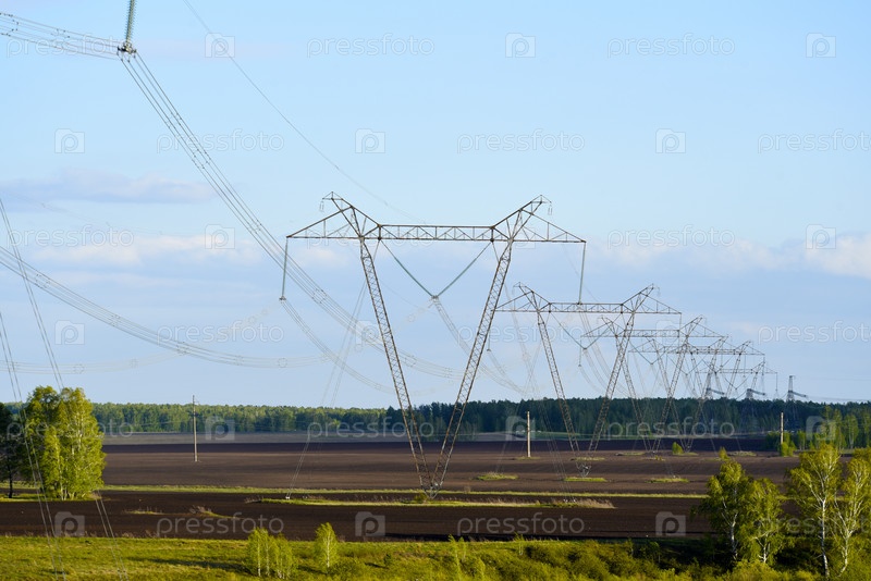 Высоковольтная линия электропередачи на фоне сельского поля. Пейзаж в деревне и электропроводка