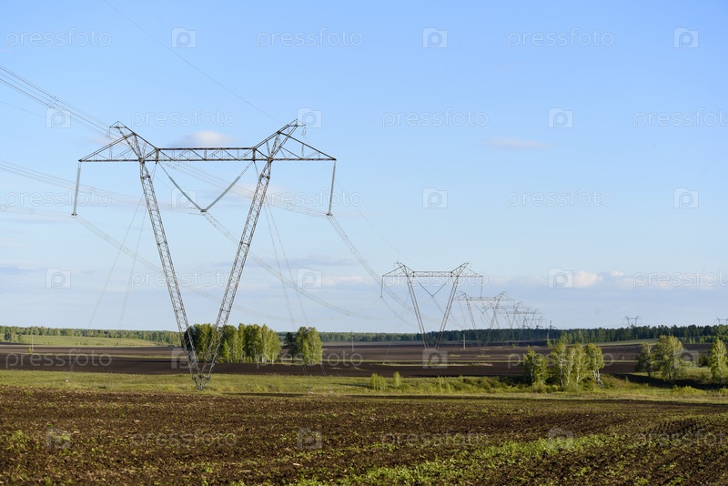 Высоковольтная линия электропередачи на фоне сельского поля. Пейзаж в деревне и электропроводка