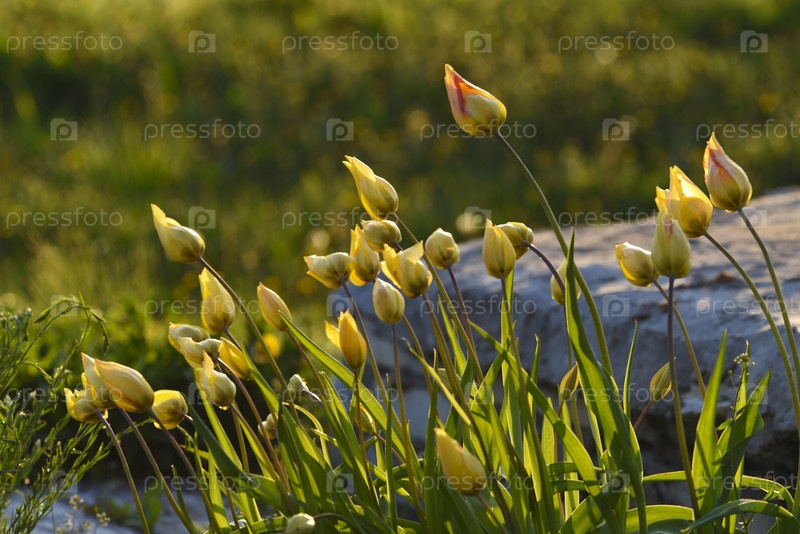 Желтые тюльпаны в солнечном свете. Куст желтых тюльпанов