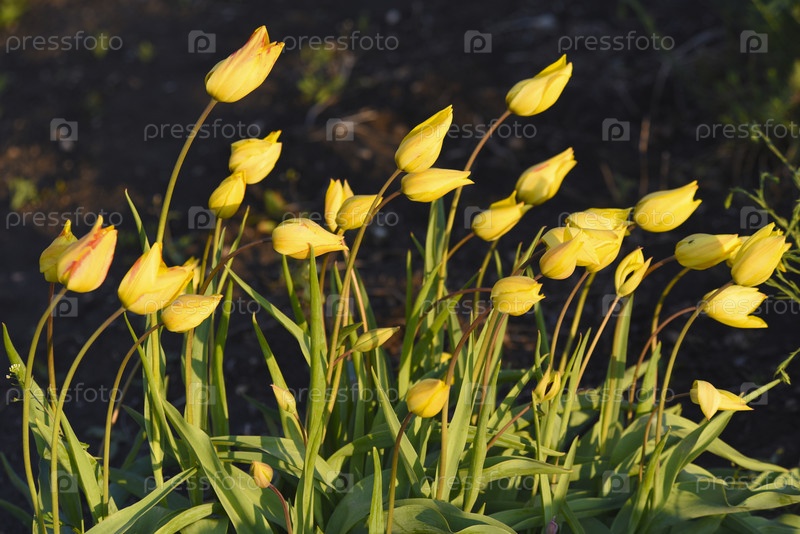 Желтые тюльпаны в солнечном свете. Куст желтых тюльпанов