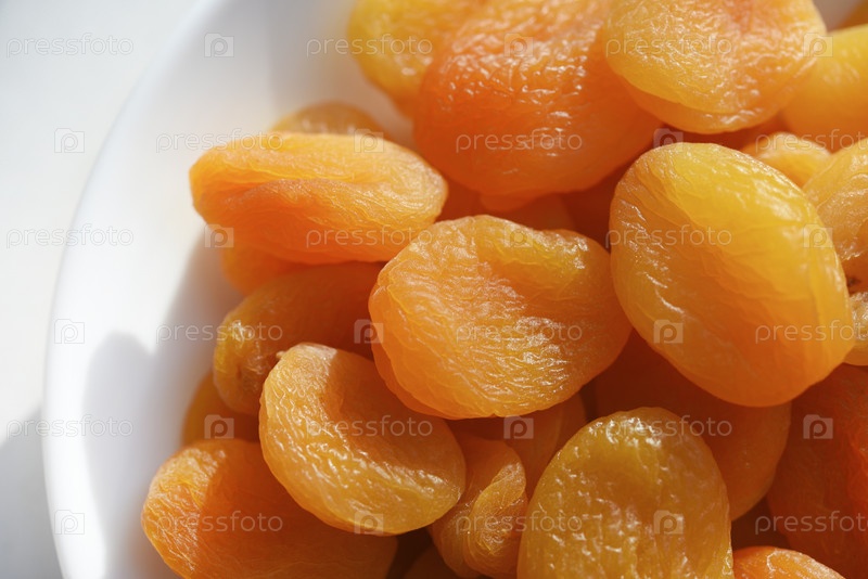 Сухофрукты. Курага сушеная. Курага крупным планом на белой тарелке