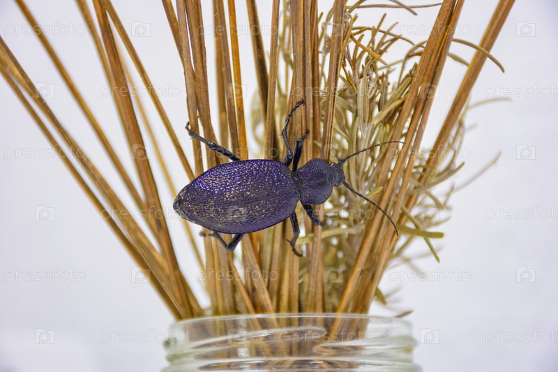 Фиолетовый жужелица крупным планом на траве, жук на сухой траве