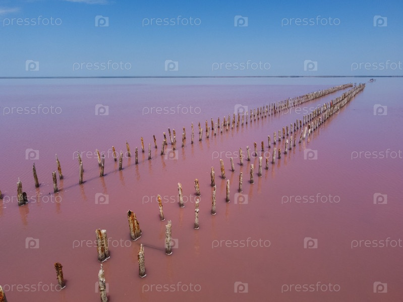 Деревянные пирсы в соленом озере, деревянные останки в розовом озере