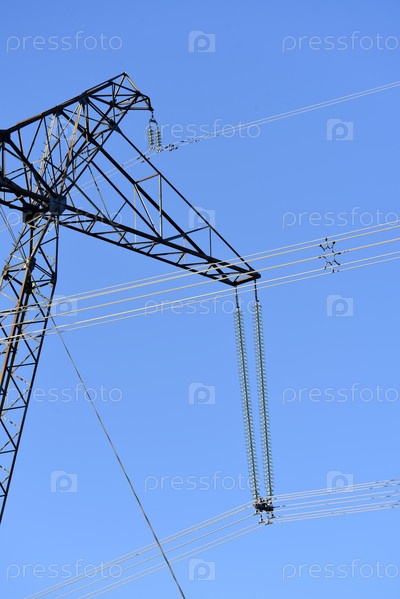 Строительство высоковольтной линии электропередачи крупным планом. Провода на фоне голубого неба