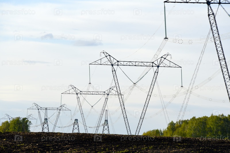 Высоковольтная линия электропередачи на фоне сельского поля. Пейзаж в деревне и электропроводка