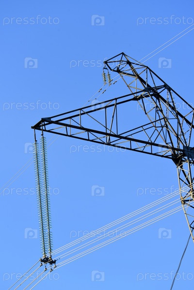 Строительство высоковольтной линии электропередачи крупным планом. Провода на фоне голубого неба