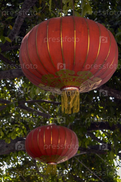 Традиционные красные китайские фонарики висят на ветке дерева
