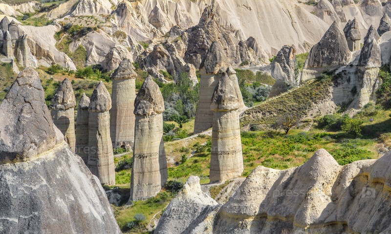Необычный пейзаж с каменными столбами и скалами в Каппадокии