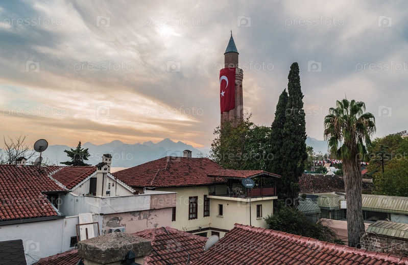 Вид на крыши и минарет с флагом Турции в старом городе Антальи