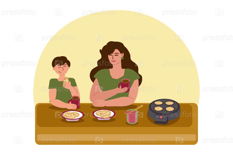 Мама и сын едят блины или оладьи с чаем