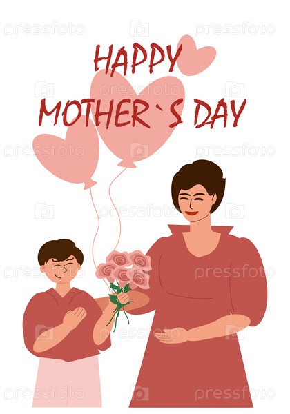 Сын дарит матери букет цветов и воздушные шары