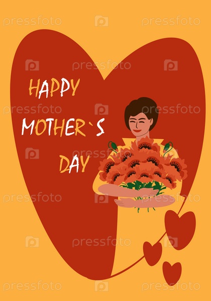 Женщина с букетом и красным сердцем на желтом