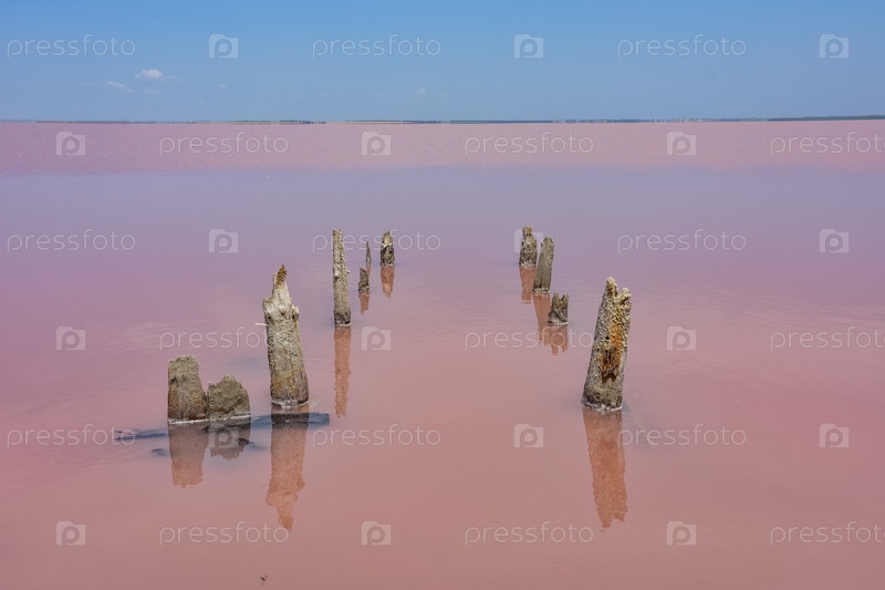 Деревянные пирсы в соленом озере, деревянные останки в розовом озере