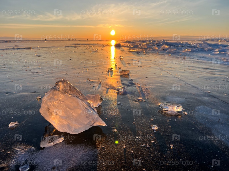 Красивый восход солнца над замерзающим озером Байкал в зимний сезон