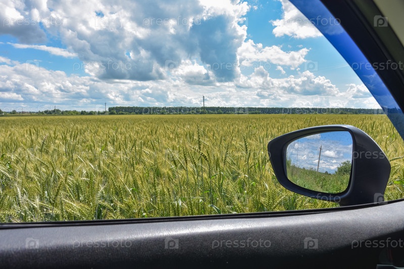 Вид из окна машины на пшеничное поле