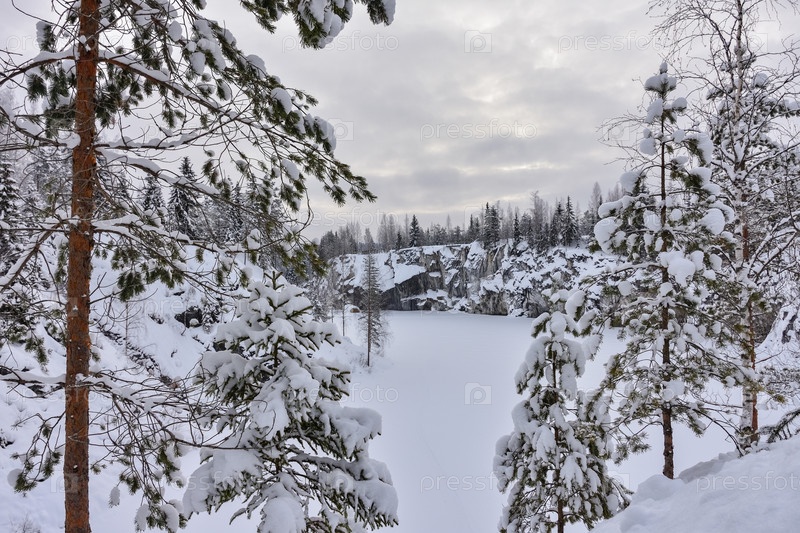 Зима в еловом лесу, ели покрыты белым пушистым снегом. Селективный фокус. Зимний пейзаж со снегом и деревьями. Заснеженные деревья в лесу зимой