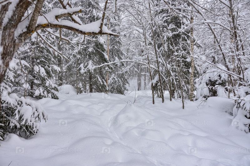 Зима в еловом лесу, ели покрыты белым пушистым снегом. Селективный фокус. Зимний пейзаж со снегом и деревьями. Заснеженные деревья в лесу зимой