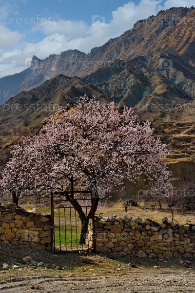 Россия. Северо-Восточный Кавказ, Республика Дагестан. Цветущие абрикосовые сады горного села Корона в долине реки Аварское Койсу