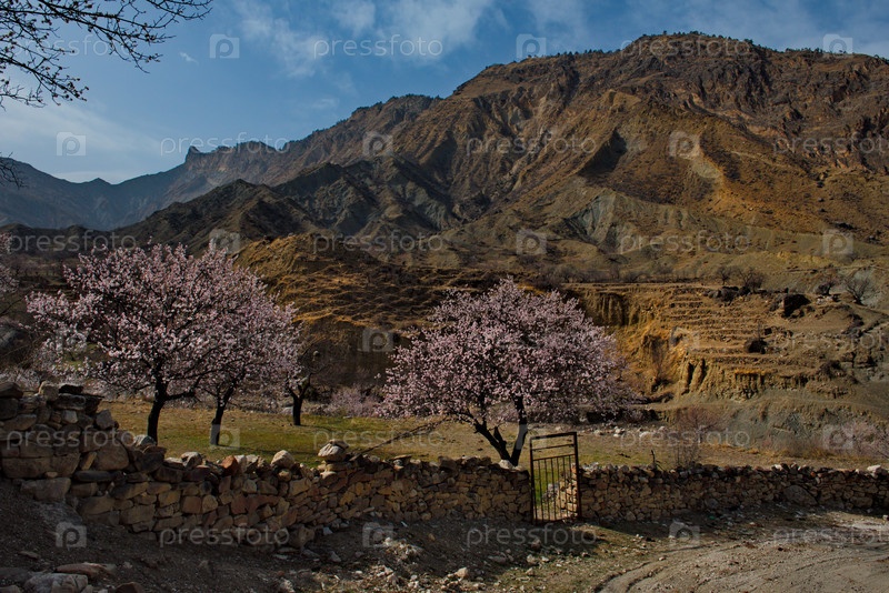 Россия. Северо-Восточный Кавказ, Республика Дагестан. Цветущие абрикосовые сады горного села Корона в долине реки Аварское Койсу