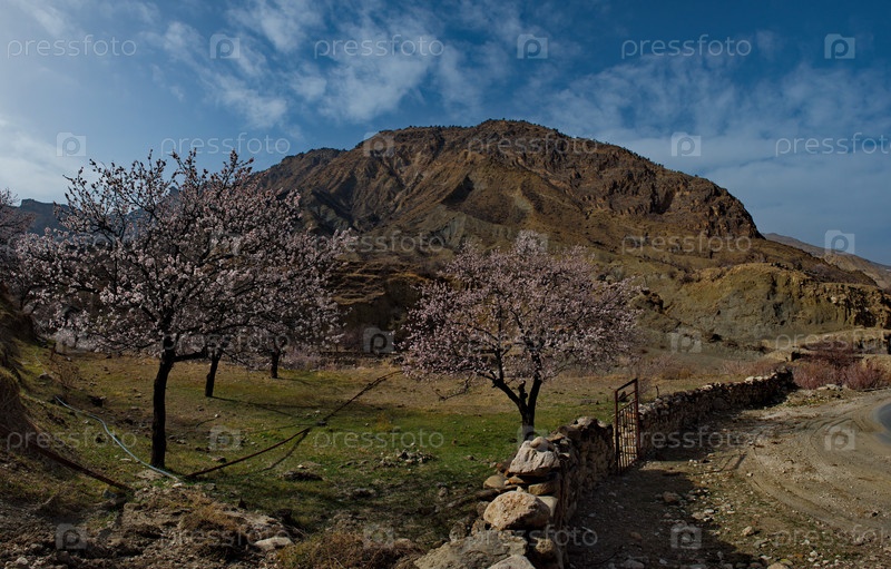 Россия. Северо-Восточный Кавказ, Республика Дагестан. Цветущие абрикосовые сады горного села Корона в долине реки Аварское Койсу