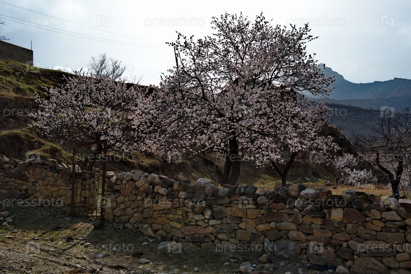 Россия. Северо-Восточный Кавказ, Республика Дагестан. Цветущие абрикосовые сады горного села Корона в долине реки Аварское Койсу