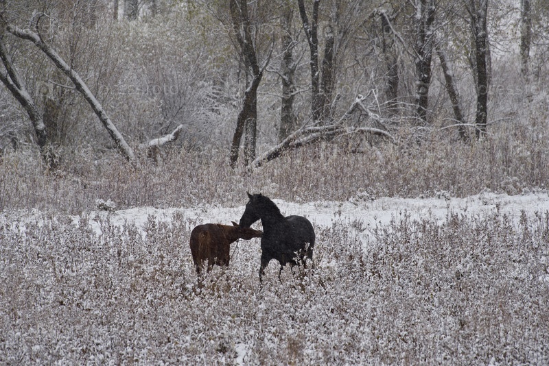Россия. Юг Западной Сибири, горный Алтай. Дождливым осенним днем две лошади выясняют отношения на заснеженном поле в горной долине реки Сема