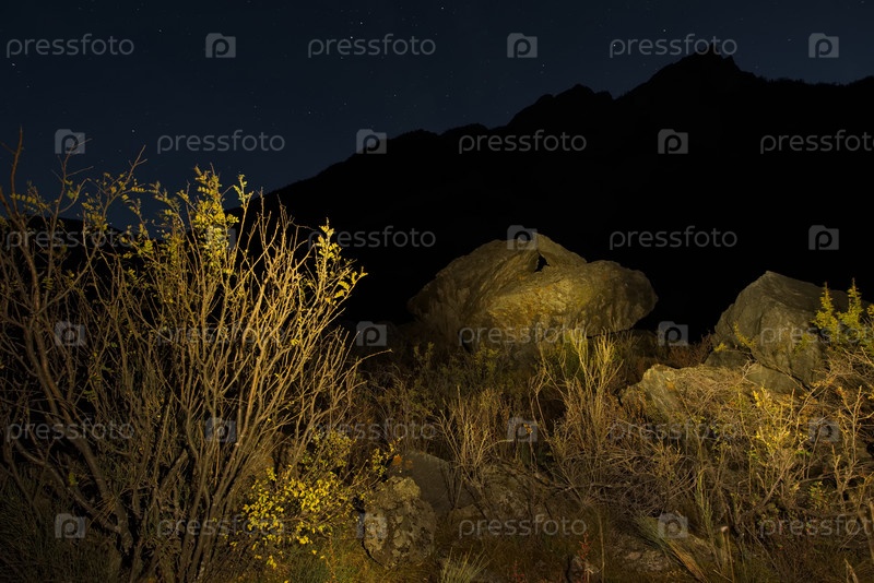 Россия. Юг Западной Сибири, Горный Алтай. Ночной вид на скопления огромных камней в долине реки Чулышман у подножия перевала Кату-Ярык