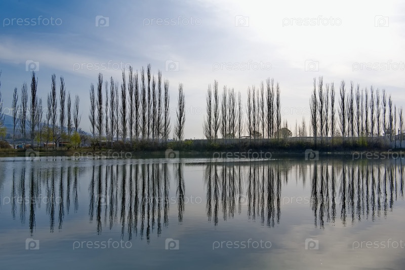 Кыргызстан. Живописные отражения пирамидальных тополей в утренней глади озера Иссык-Куль
