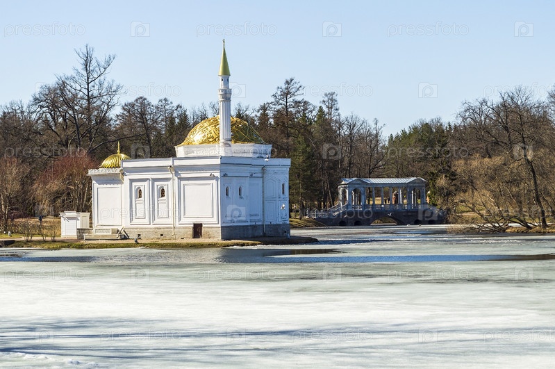 Вид на павильон "Турецкая баня" и мраморный мост на заднем плане на берегу замерзшего пруда в Екатерининском парке