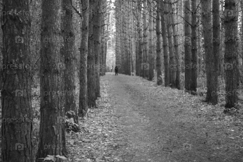 Человек, идущий по безмятежному сосновому лесу