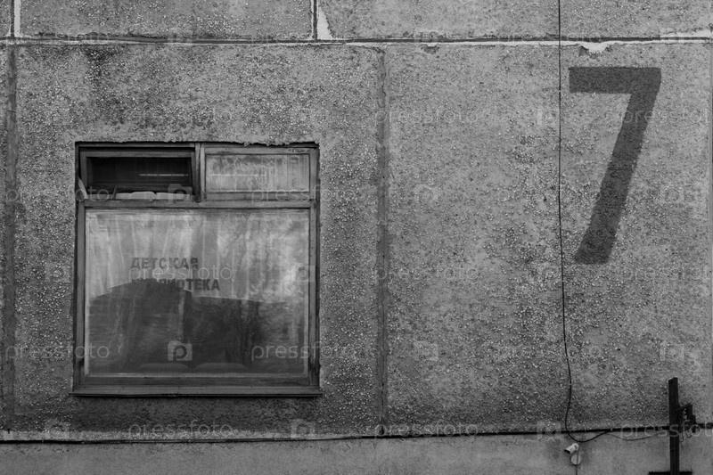 Бетонное здание с одним окном и большим номером 7