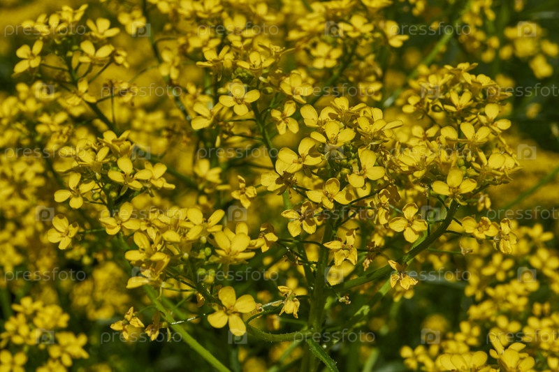 В лужайке цветет обыкновенная барбарея (лат. Barbarea vulgaris)