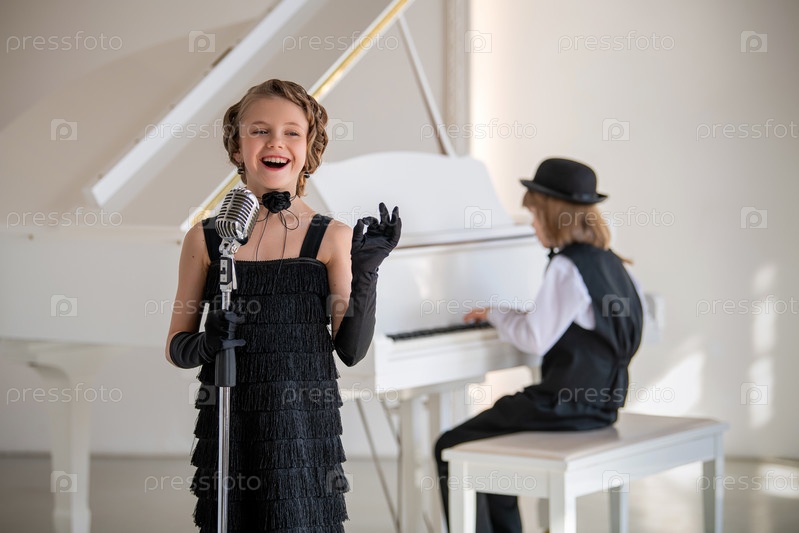 Девушка в черном платье поет в микрофон, а мальчик играет на пианино. Действие происходит в комнате с белым пианино и микрофоном. Сцена легкая и веселая