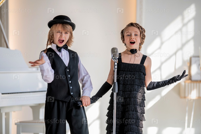 Двое маленьких детей в формальной одежде поют дуэтом в микрофон. Сцена легкая и игривая