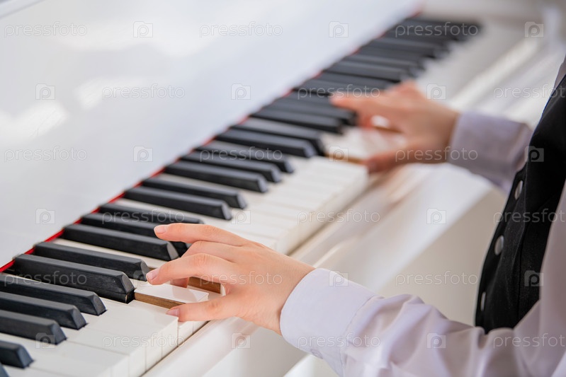 Крупный план рук ребенка, играющего на пианино. Концепция концентрации и преданности делу, когда ребенок практикует навыки игры на фортепиано