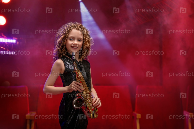 Молодая девушка-музыкант держит саксофон и улыбается. Она одета в черное платье и стоит на красном фоне в центре внимания