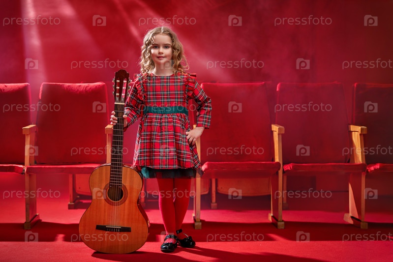 Маленькая девочка-музыкант держит гитару и улыбается