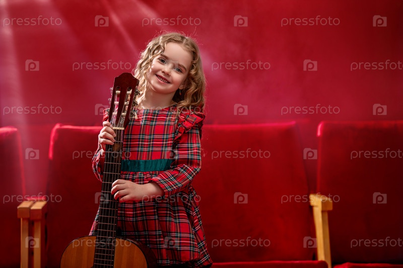 Маленькая девочка-музыкант держит гитару и улыбается. Она стоит на красном фоне в центре внимания