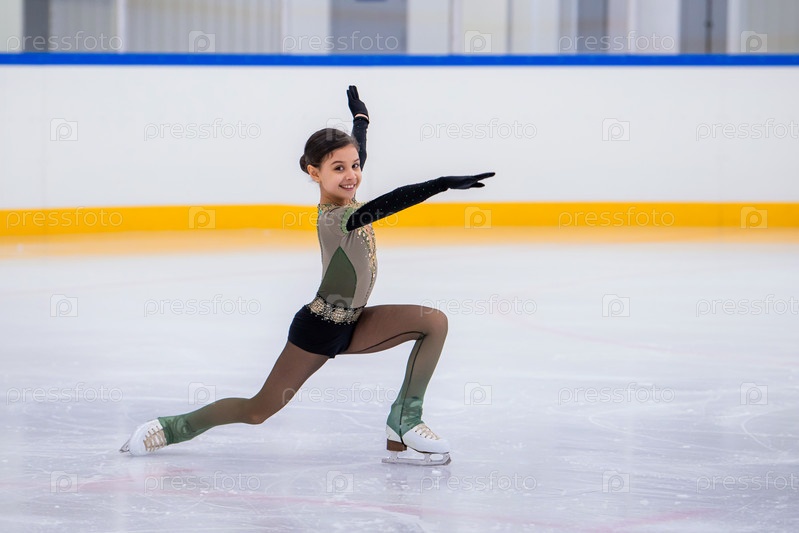 Молодая девушка катается на льду с улыбкой на лице. Она одета в черный костюм и в перчатках