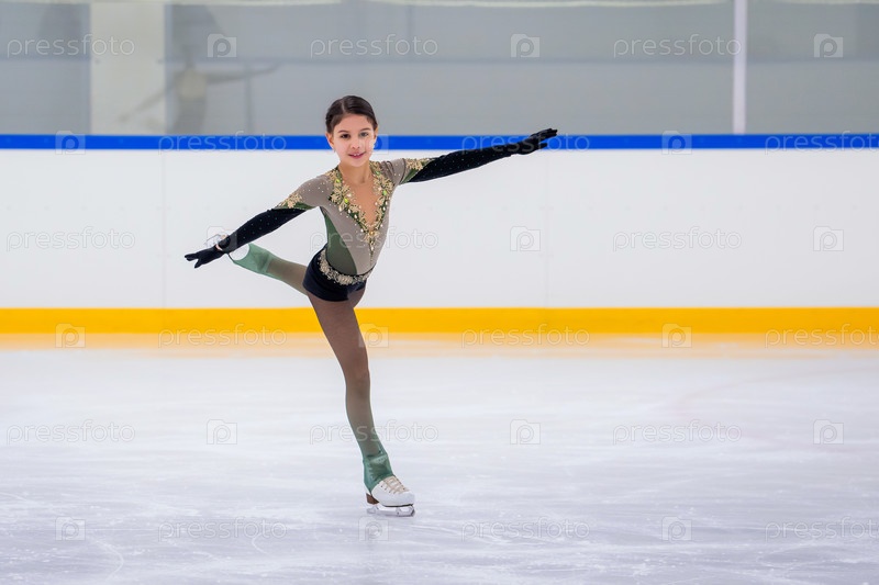 Молодая девушка катается на льду с улыбкой на лице. Она одета в черный костюм и в перчатках