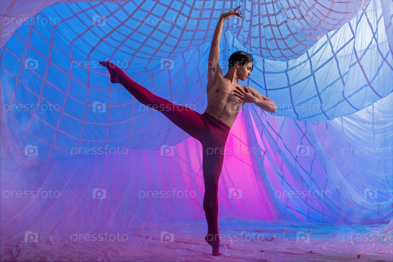 Мужчина в красном костюме танцует на синем фоне