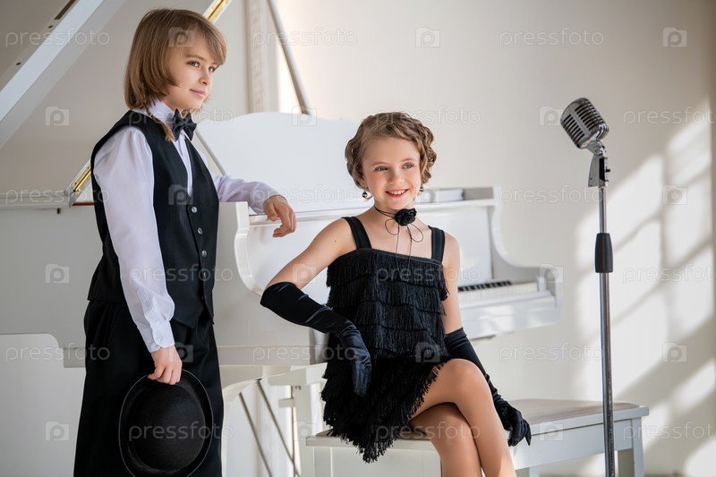 Двое детей, одетых в черно-белое, позируют перед фортепиано. Сцена игривая и беззаботная: дети одеты в официальные наряды и, кажется, развлекаются