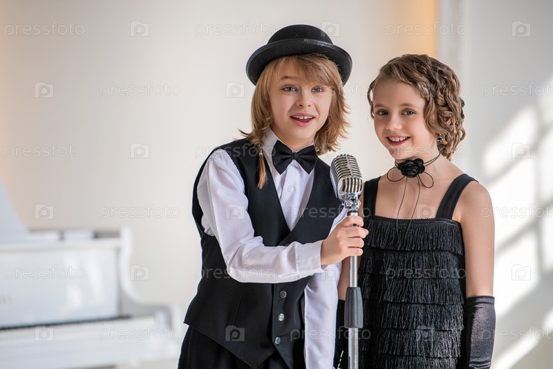 Двое маленьких детей в формальной одежде поют дуэтом в микрофон. Сцена легкая и игривая