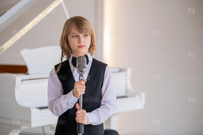 Мальчик в черном жилете и галстуке-бабочке поет в микрофон. он улыбается ей, и ей нравится петь