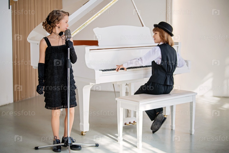 Девушка в черном платье поет в микрофон, а мальчик играет на пианино. Действие происходит в комнате с белым пианино и микрофоном. Сцена легкая и веселая