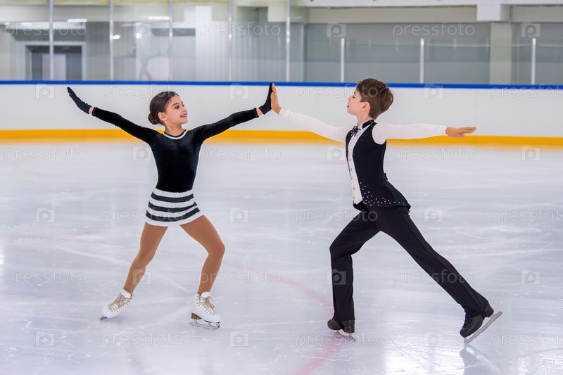 Юноша и девочка-фигуристы исполняют номер на льду. На девочке синее платье, а на мальчике костюм