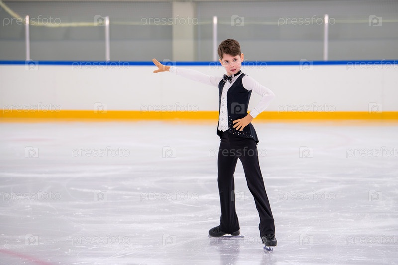 Мальчик катается на льду с вытянутыми руками. На нем черный костюм, и он выполняет трюк