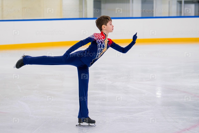 Мальчик катается на льду с вытянутыми руками. На нем черный костюм, и он выполняет трюк