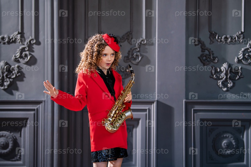 Молодая девушка в красном пальто и шляпе держит саксофон. Она улыбается и ей весело. Понятие радости и игривости, когда девушка одета и играет на музыкальном инструменте